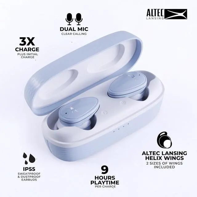 Engineered with a 0.25 driver and the new Realtek TRL8773EFE chipset, these sport earbuds deliver crisp audio and low-latency performance. Whether you're at the gym or on a run, the IP44 waterproof earbuds and full Altec helix wing ensure a secure, sweat-resistant fit. Enjoy 9 hours of playtime, and with the charging carry case, extend your total use to 36 hourswith fast charge capabilities giving you an hour of play from just 5 minutes of charging.