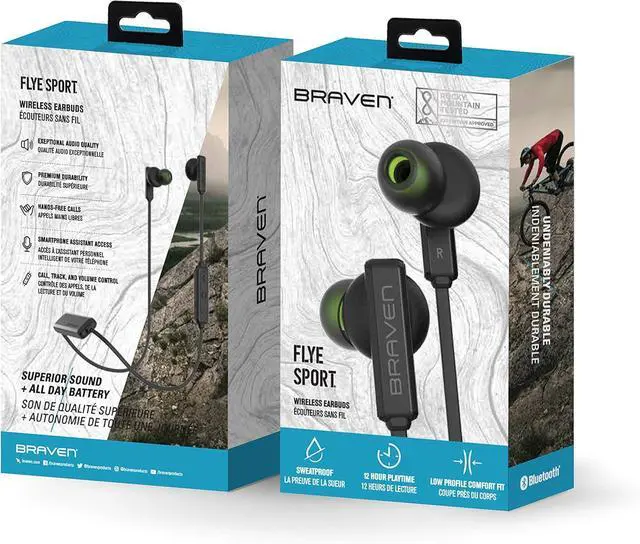 Mobilize your music with the wireless Braven Flye Sport wireless earbuds. So lightweight youll forget theyre there, These Hi-Fidelity earbuds seamlessly pair and stream music from your smartphone for up to 12 hours of continuous playback. Three sizes of included ear bullets provide secure fit and lasting comfort, with a water-resistant coating thats best matched by Carving fresh powder on the slopes, crushing Leg day at the gym or anything in between.