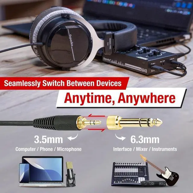 Seamless Connectivity for Any SetupEquipped with a 3.5mm plug and a 6.3mm adapter, these headphones easily connect to a wide range of audio gearfrom mixers and guitars to mobile devices. Featuring a durable 8.2 ft straight cable, these studio headphones deliver reliable performance whether you're in the studio, DJing, or podcasting.