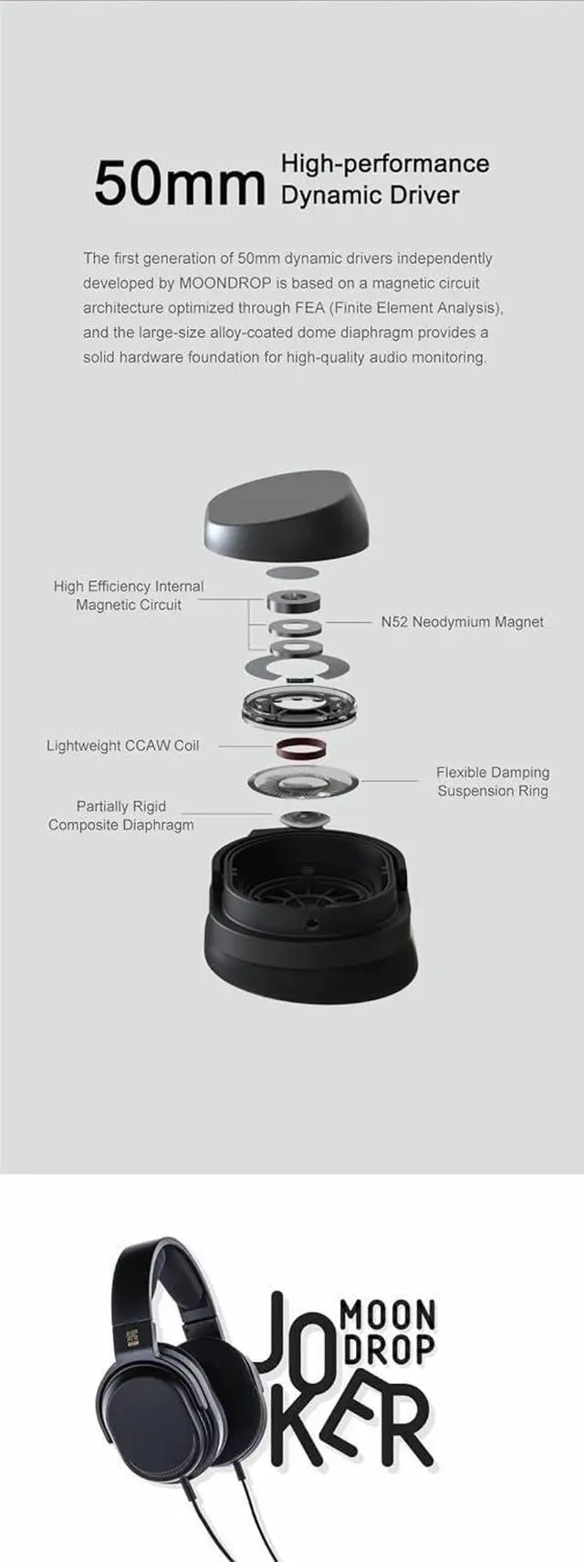 High-performance 50mm Dynamic Driver: The first generation of 50mm dynamic drivers independently developed by MOONDROP is based on a magnetic circuit architecture optimized through FEA (Finite Element Analysis), and the large size alloy-coated dome diaphragm provides a solid hardware foundation for high-quality audio monitring.