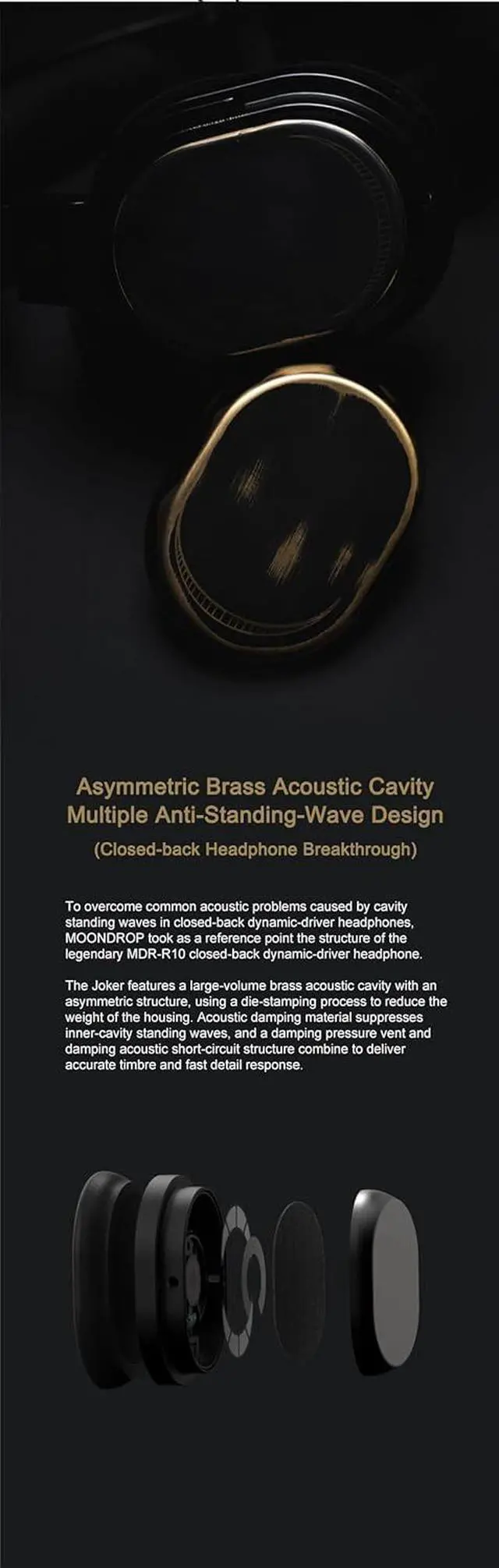 Asymmetric Brass Acoustic Cavity, Multiple Anti-Standing-Wave Design (Closed-back Headphone Breakthrough) : To overcome common acoustic problems caused by cavity standing waves in closed-back dynamic driver headphones, MOONDROP took as a reference point the structure of the legendary MDR-R10 closed back dynamic-driver headphone.