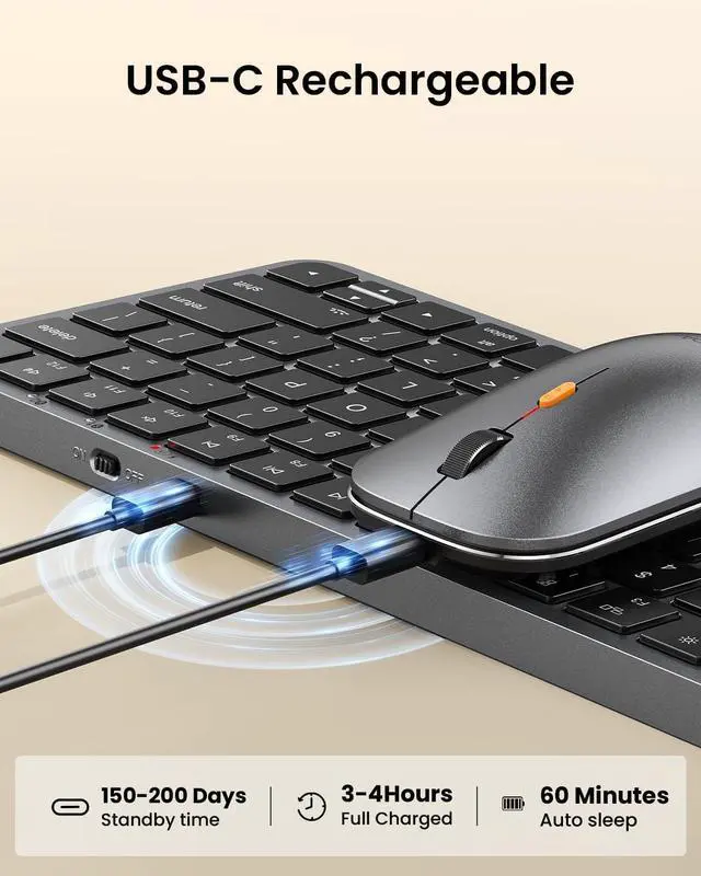 Rechargeable and Eco-Friendly: Features a built-in 1200mAh rechargeable battery for keyboard, 500mAh for mouse, entering sleep mode after 60 minutes of inactivity to conserve energy. Easily awaken the keyboard with any key press, with manual reactivation needed for backlighting. Note: The provided cable is intended solely for charging purposes and cannot be used for wired data transmission