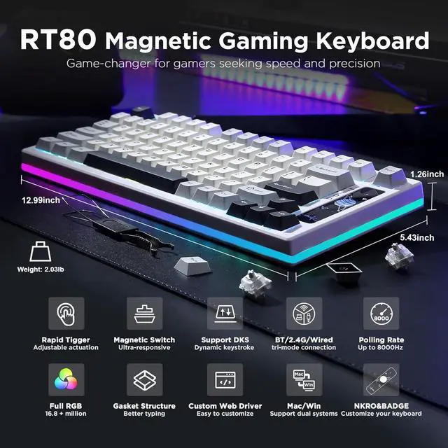 RT80 Rapid Trigger Keyboard with Gateron Magnetic Switches: The RT80 Hall Effect keyboard, equipped with Gateron White magnetic switches and advanced Rapid Trigger tech, adjustable actuation, and responsive features. Key highlights include Fast Key Reset, Dynamic Keystrokes, Snap Tap, Adjustable Actuation Points, and Dual-Action Keys, 8K polling rate, delivering ultra-low latency and a competitive edge in fast-paced gaming