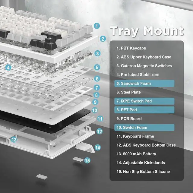 Tri-Mode Connection&NKRO:Connect up to 5 devices using Bluetooth, 2.4GHz, or USB-C, and switch seamlessly with convenient shortcuts. Designed for multi-platform use, the RT80 is compatible with Windows, macOS, iOS, and Android devices. With N-key rollover and anti-ghosting, this TKL keyboard keeps up with intense gaming sessions without keypress lag