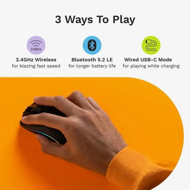 3 Ways to Play: Choose 2.4GHz wireless (110 hours of battery life), Bluetooth 5.2 LE (210 hours of battery life), or Wired Mode for uninterrupted gameplay while charging.