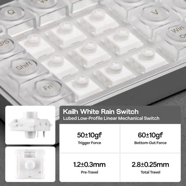Padding Cushioned Tray-Mount: The Luma40 Low-Profile Keyboard comes with a superior shock-absorbing design, where layers of soft foams cradle the PCB from the metal frame. Every keypress is dampened to be satisfying with pleasing deep sound profile. The lubed low-profile switches, in half the height of traditional mechanical switches, put less stress on your wrist to prevent pain from carpal or muscle strain.