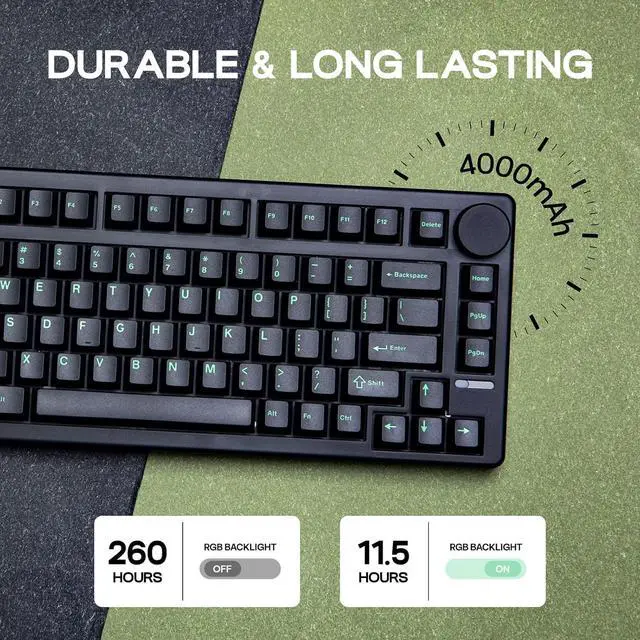 260 Hours Long-Lasting Wireless Keyboard: Unleash yourself from cable clutter and power anxiety with the QK81 wireless keyboard. Conquering the virtual worlds for weeks on a single charge. Boasting an incredible 4000mAh battery, this powerhouse delivers an astounding 260 hours of uninterrupted use with the vibrant backlight off, for a clean, minimalist desk setup, unburdened by tangled wires, offering complete freedom of movement for your mouse and peripherals. Cable wired, 2.4Ghz or Bluetooth wireless, easily switch between 3 connection modes with the toggle besides USB port, for stable performance on PC, Mac laptop, Android tablet, phones or gaming controllers