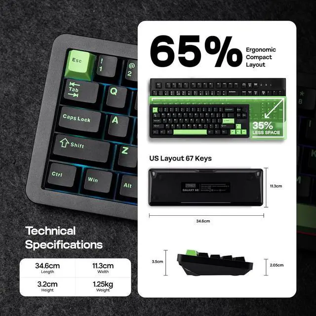 65% Aluminum Keyboard with Metal Knob: Meticulously crafted, this 67-key gaming keyboard boasts durable PBT keycaps and a satisfyingly tactile metal knob, all encased in a stylish, 1.25kg powder coated aluminum shell that promises both longevity and a premium aesthetic. The compact 65% layout, while retaining all essential keys for uncompromised experience whether you're dominating in your favorite FPS or tackling daily productivity tasks, maximize your mouse real estate for those critical in-game maneuvers. Experience the perfect blend of form, function, and enduring quality with the Galaxy68 where every keystroke is a testament to superior craftsmanship.