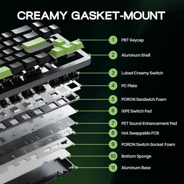 Innovative Gasket-Mount Structure: Get customization joy with the Galaxy68 for unrivalled premium feel and personalized performance. The introduction of gasket uses soft materials to separate PCB between cases for even softer landing, while the addition of flex-cut on PCB and plate gives the keyboard ultra flexibility to create the creamy buttery typing feel with no inconsistency between rows.