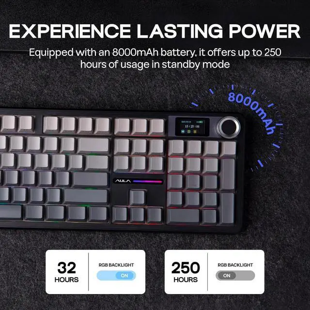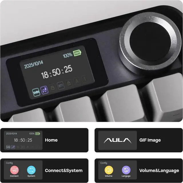 EPOMAKER X AULA F108 PRO Full Size Wireless Mechanical Keyboard with LCD Screen F108 PRO Full Size Wireless Mechanical Keyboard 360° Showcasing On Thocky Sound, RGB Backlit, Package & Size F108 PRO Wireless Gaming Keyboard How to adjust the time, date, and upload GIF images on the screen?