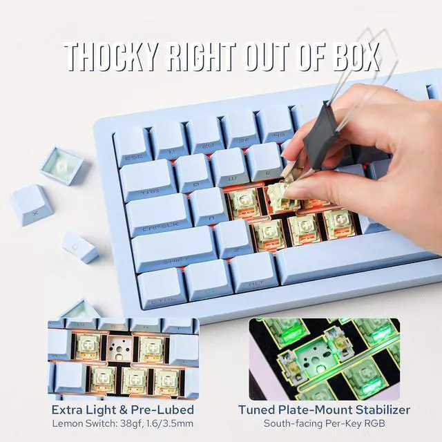 QMK Programmable Hotswappable PCBBoth the Tide 65 and Tide 75 are QMK compatible, allowing for comprehensive programmability and customization of key mappings and macros to suit any workflow or gaming setup. With a hot-swappable PCBs, users can easily swap to desired switches without any soldering required, maximizing personalization and convenience.