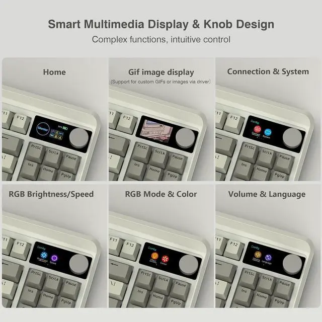 Smart OLED Color Display and Knob DesignWomier M87 PRO gaming keyboard built-in smart OLED color display can intuitively display the keyboard status, including custom gif image, caps lock, connection mode, WIN/MAC, battery. Built-in mechanical knobs allow quick adjustment of complex functions: connection, system, backlit brightness/speed, RGB mode/color, volume & language.