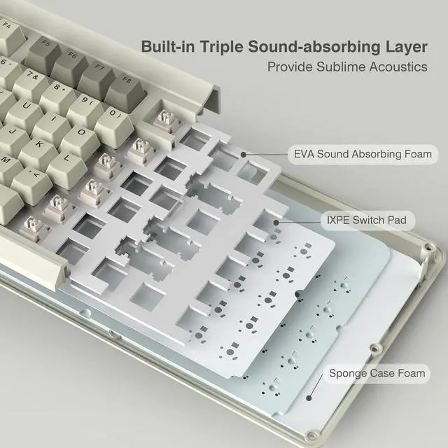 Unique silencing Installation DesignThis custom keyboard has built-in triple absorption layers, including an EVA sound absorbing foam, an IXPE switch pad and the sponge case Foam, In addition, silencer foam installed under the space bar, which increase the rebound speed of the keys while reducing vibration, resulting in improved key sound for a unique typing feel.
