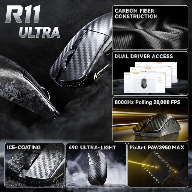 Ultra-light, only 49gATTACK SHARK R11 Ultra super lightweight mouse adopts injection-molded carbon fiber material and innovative Nano-ice coating, which reduces the excess weight. It also ensures the strength and hand feel of the mouse, which is designed for speed and precision. Perfect for all FPS, MMO, MOBA, RPG, Battle Royale and other fast-paced games.