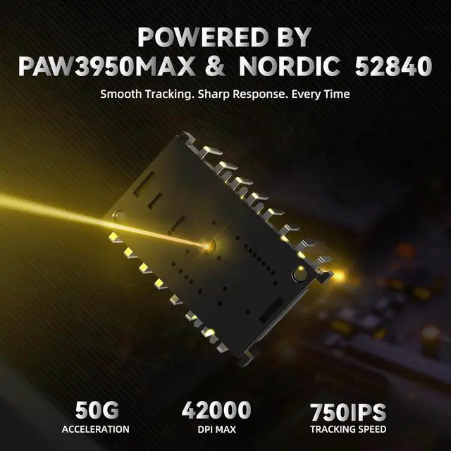 PixArt PAW3950 MAX SensorEquipped with the PixArts latest PAW3950 MAX sensor, providing top-notch accuracy and precision for fast-paced, competitive games, capable of 42,000 programmable DPI, 20000 IPS speed, 50g acceleration.
