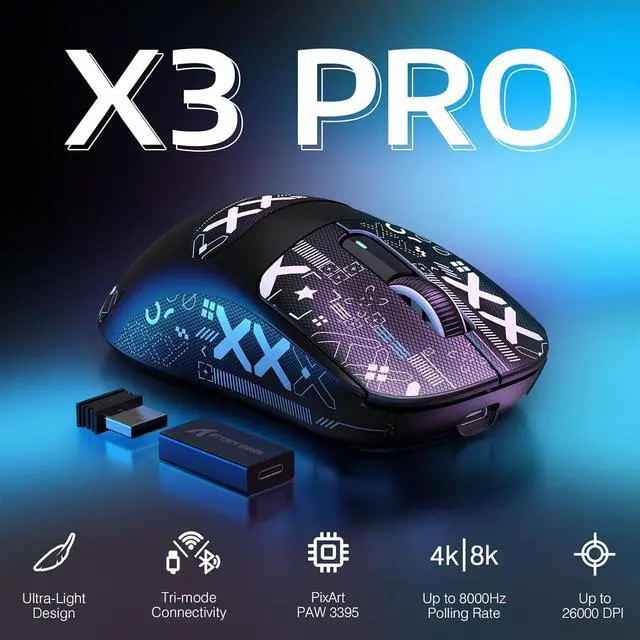 4K/8K Wireless Gaming MouseThe X3PRO Wireless Gaming Mouse equipped with wireless 4K polling and wired 8K polling ,the polling rate of can be increased to 4000Hz/8000Hz,sends a signal to the computer every 0.25/0.125 ms,4/8 times faster than other gaming mice,which is the best-in-class mouse performance and also the perfect mice choice for PC gamers seeking the pinnacle of precision and responsiveness.