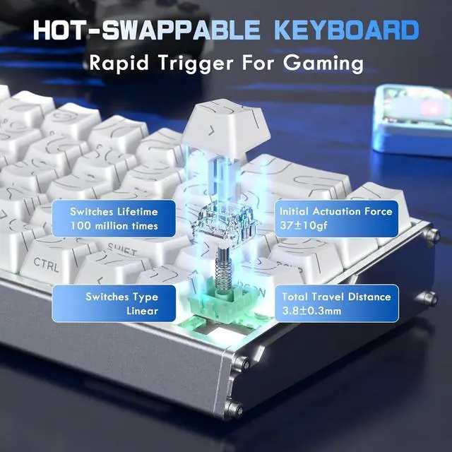 0.005mm RT Precision & Zero Dead Zone Utilizing next-gen magnetic sensing, this hall effect magnetic switch keyboard delivers 0.005mm rapid trigger accuracy with absolute zero dead zone. Supports instant stop and ultra-fast input resets, ensuring ultra-responsive control for competitive FPS and rhythm games- surpassing standard magnetic keyboards (0.01mm+)