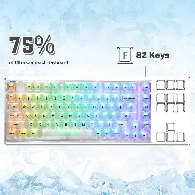 75% PC Transparent Gaming KeyboardCompact and neat,X75 Tenkeyless mechanical keyboard with Custom Coiled USB C Cable and clear keycaps will win your heart at first sight with its ultra-compact layout.Transparent PC keycaps maximally show the magic of RGB backlit.The general build quality is great and is made of a solid see through resin.fingerprints are hard to see and do not pick up any grease.