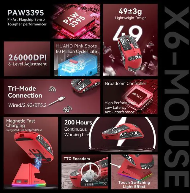 49g Ultralight & Ergonomic DesignEquipped with advanced lightweight material case, X6s weight come to an astonishing 49g, which is even lighter than an egg, making it almost the lightest mouse on market. Whats more, the ergonomic body design takes good care of various grip hand shapes and easily supports the palm of the hand. All of these design can minimize the burden of hands when using the mouse and reduce palm sweating and wrist fatigue during long-term use.