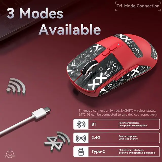 Three Modes ConnectionX6 supports three connection modes(USB-C wired mode, 2.4G wireless mode and BT 5.2 mode) to meet various using scenes. When you are at gaming, switch to the 2.4G mode and Bluetooth mode to get rid of annoying cables. When you are at working and need a stable data transmission, you can also switch to the traditional wired mode with the attached charging USB-C data cable. A maximum of 4 devices can be connected at same time, making it very suitable for multi -device work.