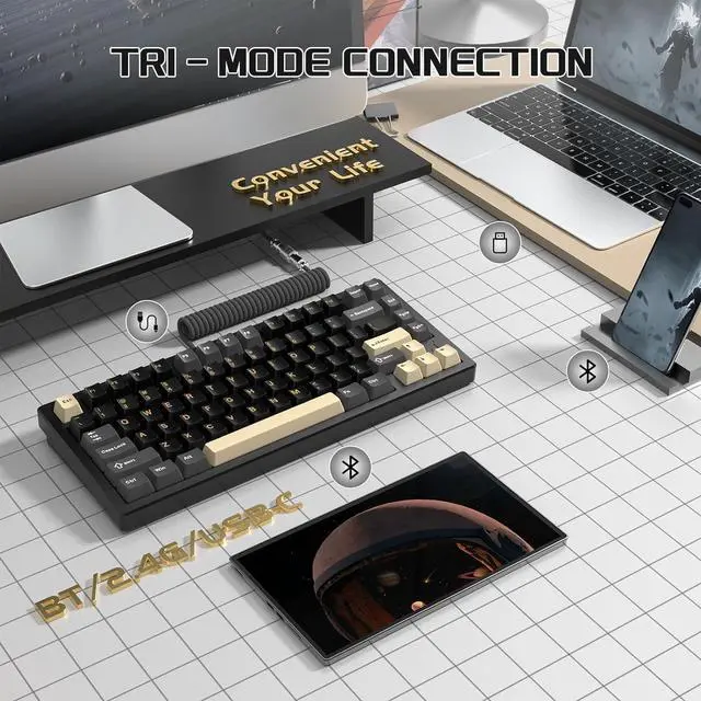 Tri-Mode Connectivity and Long-lasting BatteryThe X75 supports 2.4G wireless, Bluetooth, and USB-C wired modes, ensuring compatibility with various devices. With a high-capacity battery and NTC fast-charging IC, enjoy extended usage time and quick recharging. The integrated RGB lighting IC and upgraded RGB lighting scheme provide stunning customizable lighting effects, enhancing your gaming setup's ambiance.