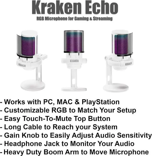 [EASY TO USE) The Kraken Echo PC gaming & streaming microphone set doesn't require ANY additional devices, or complicated wiring like others mics. This USB gamer microphone for PC is compatible with Windows, Mac OS and Mac/PS4/PS5. The 8.3ft (2.5m) USB cable is long enough to extend from behind the mic to the desktop for clear audio gaming, singing, streaming & recording.
