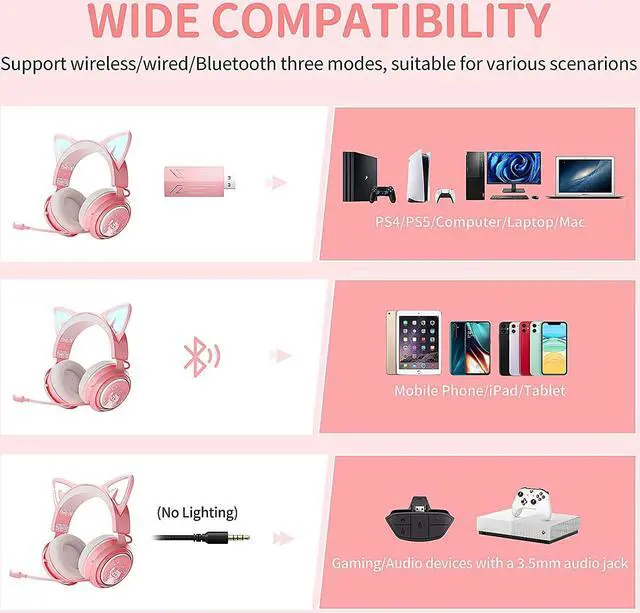 Dual-wireless Technology - Our cat ear headset offers versatile compatibility. Connect effortlessly using the 2.4GHz wireless USB dongle, ensuring a stable and lag-free connection for PS4, PS5, laptops, and PCs. Enjoy the convenience of Bluetooth functionality for calls, music, and gaming on the go. For added flexibility, we include a detachable 3.5mm auxiliary cable, allowing support for all gaming platforms.