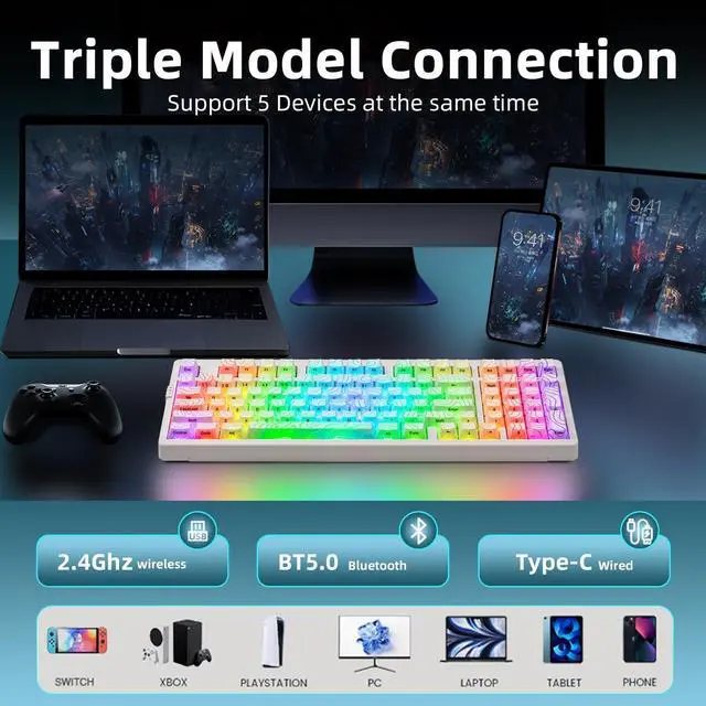 RGB Lighting with 22 Preset ModesYou Can Enjoy vibrant RGB lighting with 22 preset modes, including south-facing LEDs and edge glow. Combined with high-transparency keycaps, the keyboard creates an immersive, stylish setup right out of the box.