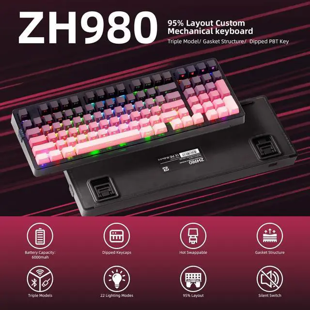 Pre-lubed Silent Linear SwitchesThis wireless keyboard uses ZORNHER's self-developed silent tactile switches for a truly silent office. With clear press feeling and quiet typing environment, ZORNHER ZH980 silent mechanical keyboard is a good partner for your office.