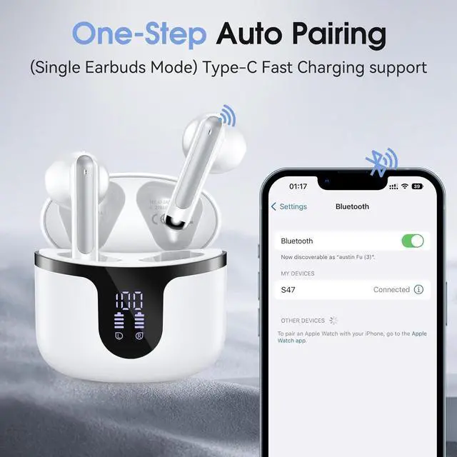 Dual LED digital display and 50 hours of continuous music: These in-ear Bluetooth headphones are equipped with a unique smart digital LED display that accurately shows the remaining charge in digital form. These Bluetooth headphones provide up to 8 hours of high-quality sound output on a single charge, and the included charging case provides an additional 5 charges for a total of 40 hours of playback time. Thanks to the Type-C charging port, charging takes only 1 hour