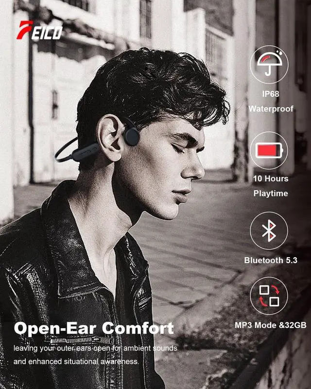 1PAKAGE LIST2OPEN-EAR WITH MIC3OPEN EAR SAFETY4SUITABL SCENE5BLUTOOTH 5.3 PROFESSIONAL IP68 WATERPROOF Innovative charging technology & long battery life MP3 Mode Built-in 32GB memory Advanced vibrator & HI-FI Sound Quality 10 hours playtime Magnetically charged
