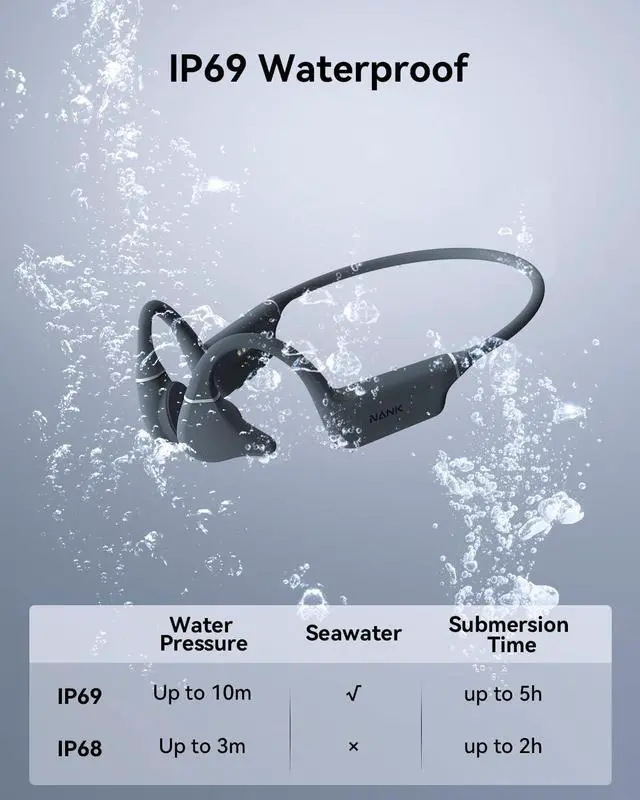IP69 Swimming HeadphonesCertified with top-level IP69 waterproofing, these swimming headphones combine nano waterproof coating technology with ultrasonic welding for a waterproof rating that exceeds industry standards. They support swimming and diving in various environmentsNote: Please use MP3 mode while swimming as there are Bluetooth mode is not good for swimming!