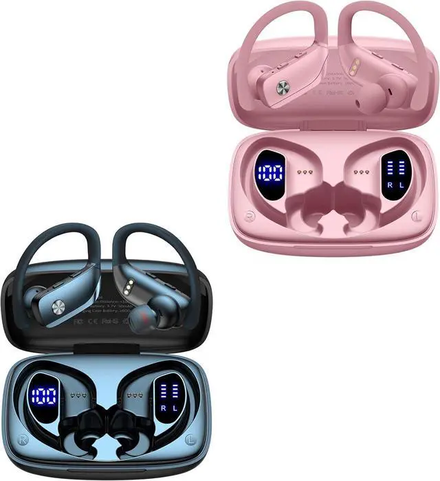 bmani 2 Sets Wireless Earbuds Bluetooth Headphones 48hrs Play Back Sport Earphones with LED Display Over-Ear Buds with Earhooks Built-in Mic Headset for Workout Black + Pink