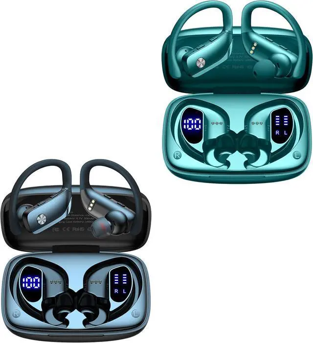 bmani 2 Sets Wireless Earbuds Bluetooth Headphones 48hrs Play Back Sport Earphones with LED Display Over-Ear Buds with Earhooks Built-in Mic Headset for Workout Black + Green