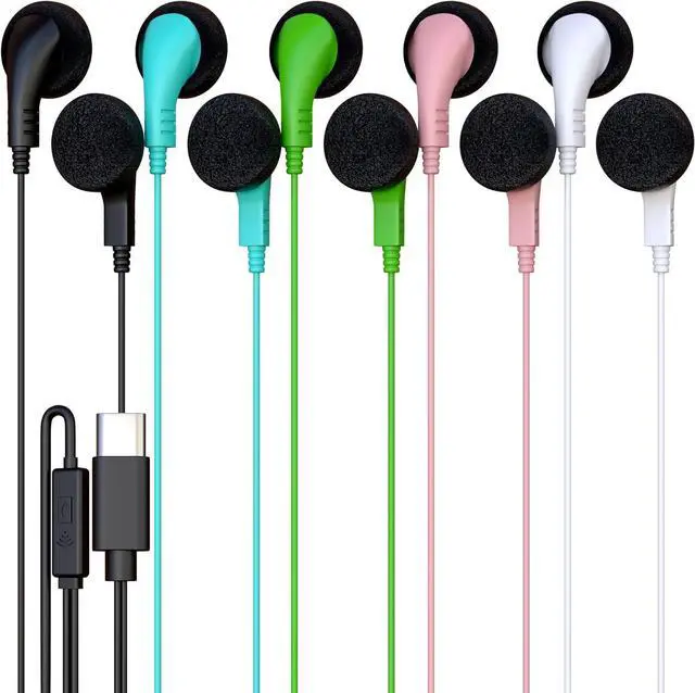 These USB-C wired earbuds come in five colorspink, blue, green, white, and blackmaking them easy to assign or organize for group use. Each pair features soft foam pads and a shallow in-ear fit, offering comfort without silicone tips. The built-in microphone and 1-button controller allow easy handling of calls, media playback, and voice assistants. With a 4ft tangle-free cord and a USB-C connector, these earbuds are compatible with Chromebooks, USB-C tablets, Android smartphones, and laptops. Perfect for bulk use in schools, offices, events, libraries, call centers, and travel kits. Each unit is individually wrapped for hygiene and convenience.