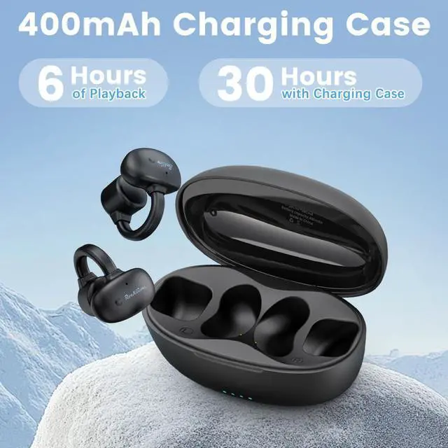 Super Long Battery Life: This Bluetooth clip-on earphone has a powerful battery capacity that provides 6 hours playtime and 30 hours with Charging Case, allowing you to enjoy your favorite music and answer calls all day! The bone conduction earphones are equipped with Bluetooth 5.3 technology, providing fast pairing and stable connection for a worry-free listening experience.