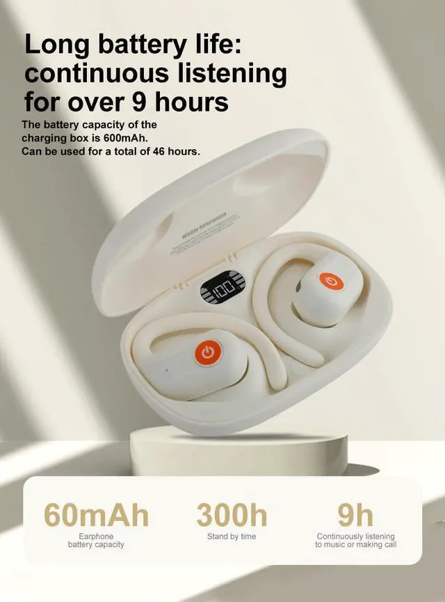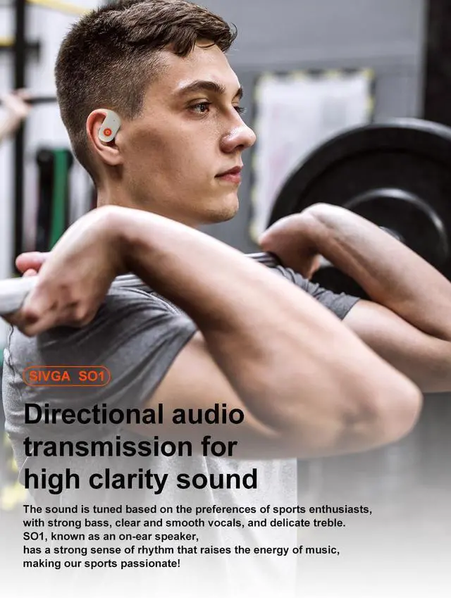 OPEN EAR DESIGN Breaking the tradition with directional audio transmission while air conduction technology delivers high-quality sound without blocking your ears. The inner side of the earphone is designed with an ergonomic curved surface, which does not compress the ear cavity , achieving a truly seamless wearing effect. It is comfortable and not painful with long time wearing.