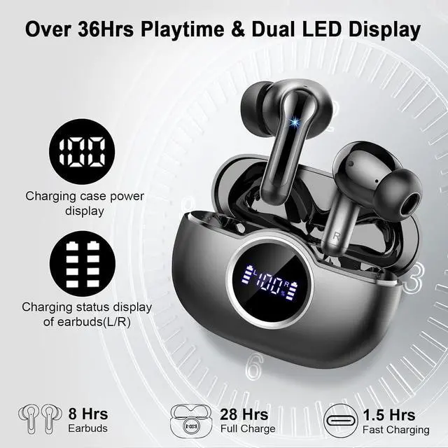 40Hrs Playtime, Real-time LED Power DisplayThe ear buds wireless can last 6-8 hours playtime from a single charge and provides extra 36 hours playtime with charging case. Dual LED battery display design, You can precisely control the power status of the charging box(0-100%)and each wireless ear bud when in charging. Equipped with USB-C cable offers you more quick and stable charging. Ensure that you always know the remaining battery level and enjoy uninterrupted music experience during long journeys or busy workdays.