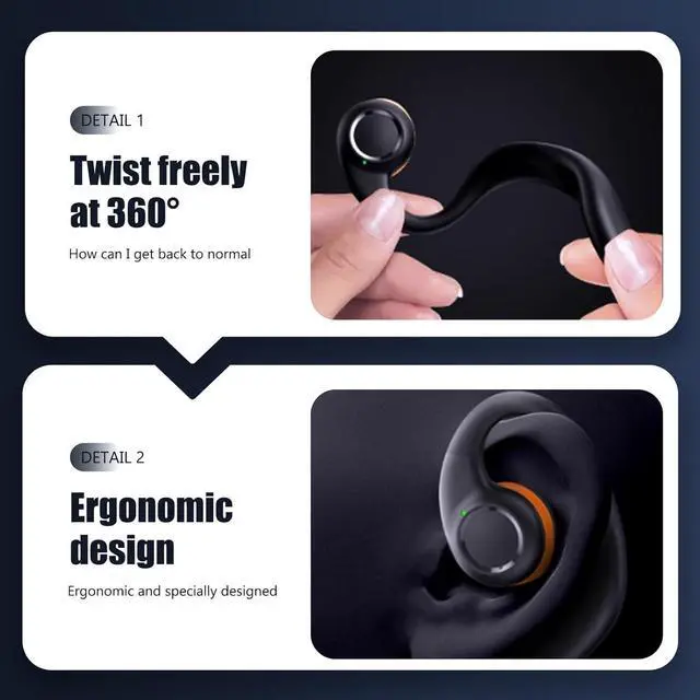 Ergonomic 360° Rotatable Design for All-Day Comfort Featuring an ergonomic curve design, the open ear headphones support 360° flexible rotation to precisely fit different ear contours. Suitable for various head sizes, they wont rub against glasses or pinch ears. The open-fit hook structure avoids ear canal pressure, ensuring fatigue-free wear during sports, commuting, or work.
