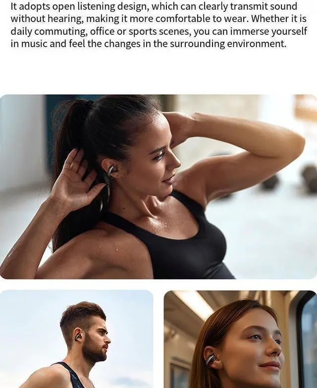 Stay Aware of the SurroundingsThe open ear sports earbuds allow you to stay connected to your surroundings while immersed in the music. Suitable for any occasions including exercising or cycling outdoors. The ergonomic ear hook fit perfectly the curve of your ears, staying in place. Wont fall off even when you are running. With IPX5 waterproof, no need to worry about sweat or rain.