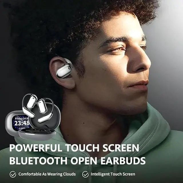 Ergonomic Design with Earhooks: Designed for active individuals, these Intelligent Touch Screen Open Bluetooth Earphones are equipped with comfortable earhooks that securely hold the Wireless Open Ear Bluetooth Earbuds in place during intense workouts or outdoor activities