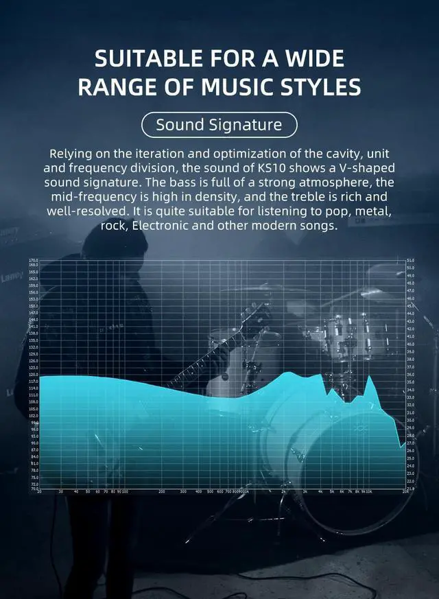 "Suitable ForA Wlde Range OF Music Styles KBEAR KS10 iem headphones relying on the iteration and optimization of the cavity, unit and frequency division, the sound of KS10 wired headphones shows a V-shaped sound signature. The bass is full of a strong atmosphere, the mid-frequency is high in density, and the treble is rich and well-resolved. It is quite suitable for listening to pop, metal, rock, Electronic and other modern songs. "
