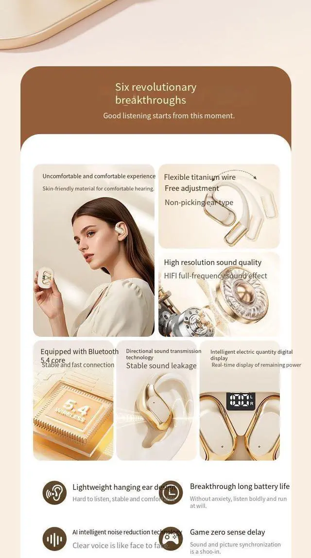 Open Ear DesignOpen ear Bluetooth Headphones feature a revolutionary ergonomic design, allowing you to enjoy your favorite music while staying aware of the surrounding environment. With this innovatively designed sports earbuds, you can hear external sounds clearly without compromising on comfort. The open bluetooth earphones has a unique shape, without being plugged into the ear canal, no longer pain your ear because of long time wearing.