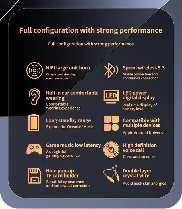 Bluetooth 5.3 TechnologyWireless earbuds Headphone adopt the latest Bluetooth 5.3 technology,which delivers high-fidelity audio for a more stable connection and stronger signal transmission. Compatible with both iOS and Android devices, tablets, laptops, TV,etc.