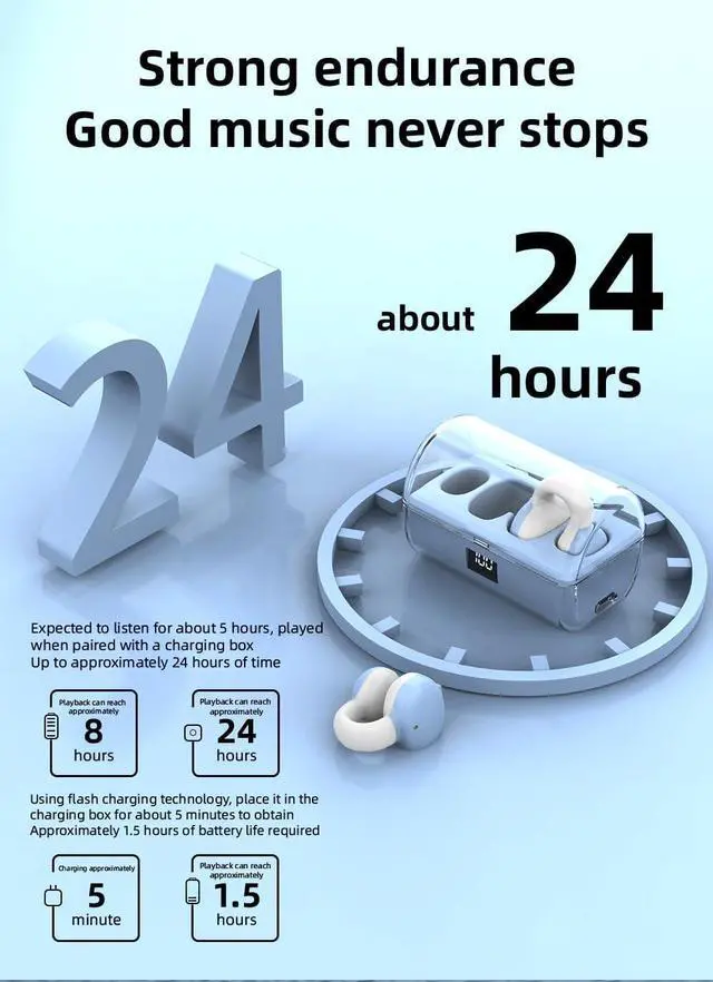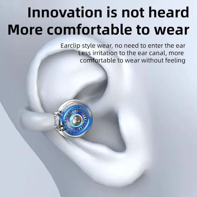 Open Ear Clip Ergonomic EarbudsReversing the ergonomic design with a completely open design, it allows you to respond politely to others while listening to the sounds of the external environment. It gently clips onto the ear like a clip, and the earbuds' earpiece rests on the cochlea, making them very comfortable to wear. The unique shape of the open Bluetooth headset eliminates the need to plug the ear canal, so no more ear pain from extended wear.