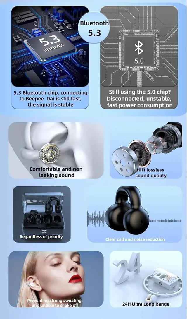 Premium Sound & Widely CompatibleOpen ear headphones has the latest Bluetooth V5.3 chip to ensure smooth connection, and connect immediately. Earbuds is based on the design idea of Hi-Fi professional headphones give you listening experience with clear sound, powerful volume, and a rich bass.