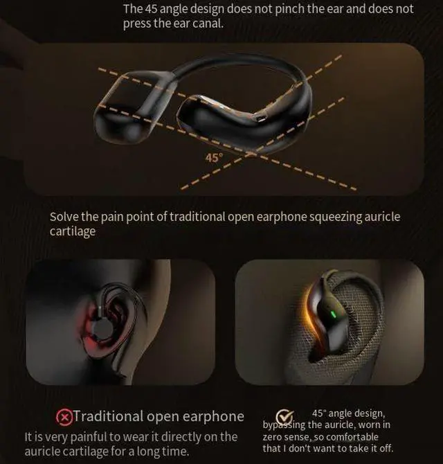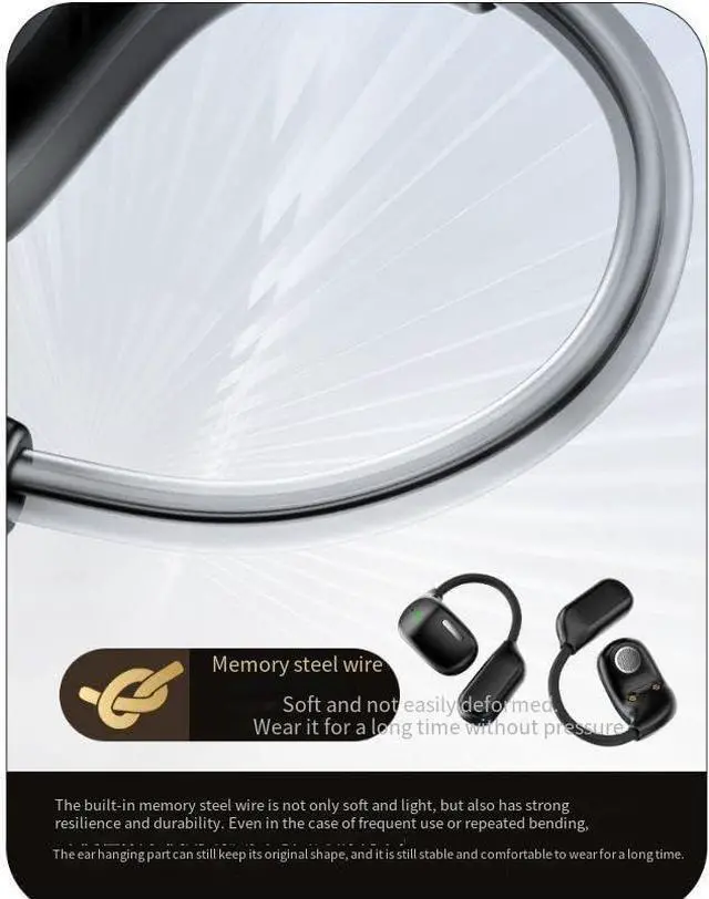Open Ear DesignOpen Ear Clip Bluetooth Headphones feature a revolutionary ergonomic design, allowing you to enjoy your favorite music while staying aware of the surrounding environment. With this innovatively designed sports clip earbuds, you can hear external sounds clearly without compromising on comfort. The open bluetooth earphones has a unique shape, without being plugged into the ear canal, no longer pain your ear because of long time wearing