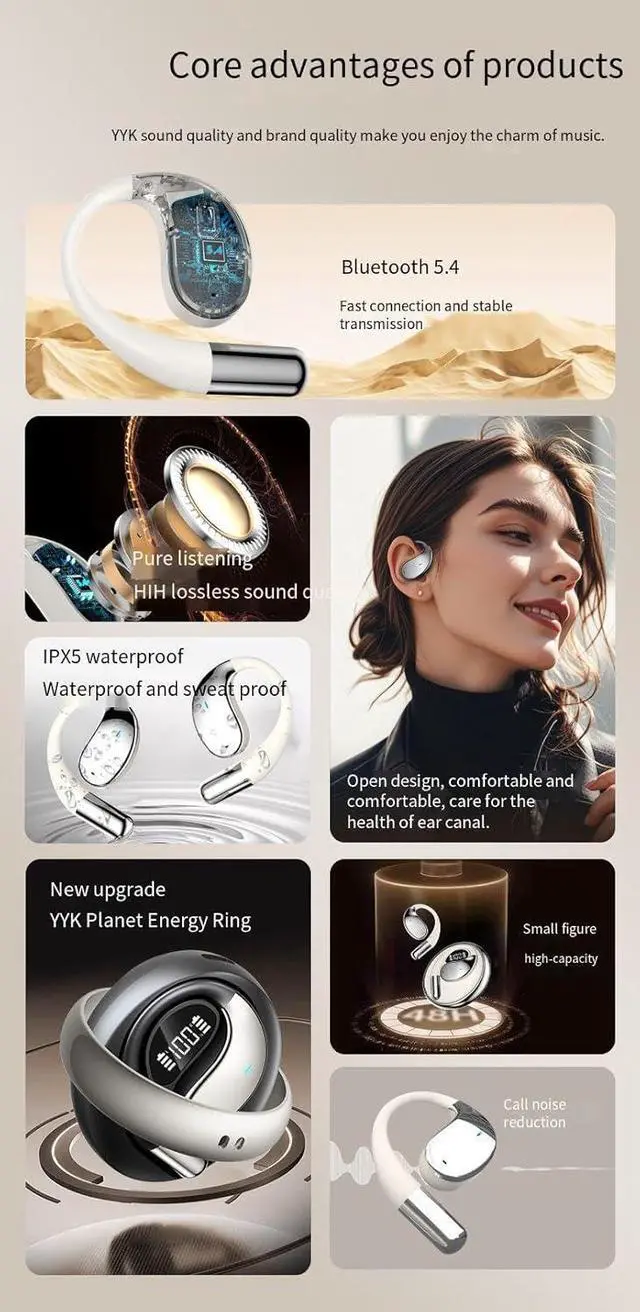 Open Clip Ear DesignOpen Ear Clip Bluetooth Headphones feature a revolutionary ergonomic design, allowing you to enjoy your favorite music while staying aware of the surrounding environment. With this innovatively designed sports clip earbuds, you can hear external sounds clearly without compromising on comfort. The open bluetooth earphones has a unique shape, without being plugged into the ear canal, no longer pain your ear because of long time wearing