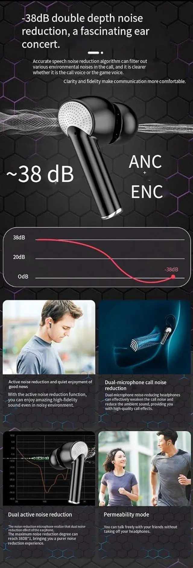 No Noise: The wireless earbuds are equipped with Qualcomm CVC 8.0 intelligent noise cancellation technology, which can effectively block background noise and pick up your voice accurately, so that the other party on the call can hear our voice more clearly