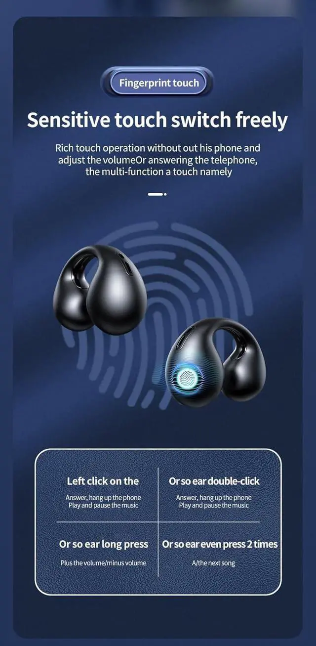 One Button Smart Touch ControlThe open ear bluetooth headphone with one touch button can be easy to control. Operations like play/pause, next track, answer the phone, reject the phone, voice assistant, volume +/- can be done via the touch button. (Please refer to the user manual.)